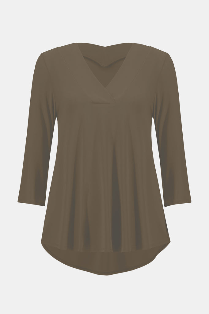 Elegance in its sheer simplicity. This silky knit top features a chic V-shaped neckline at the front and back, giving the piece an alluring and timeless appeal. The flared sweep brings an airy feel, creating a graceful silhouette. The three-quarter sleeves complement the design’s polished look.