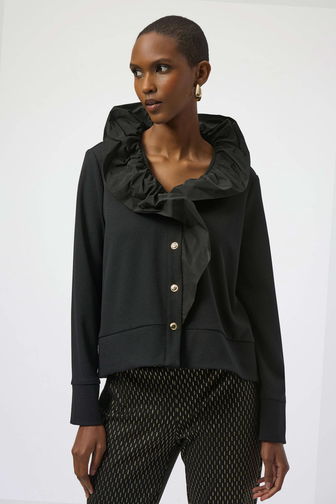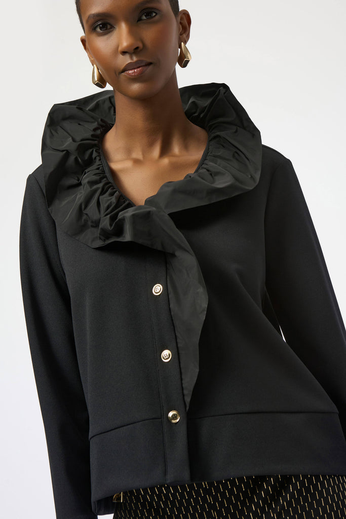 Crafted from scuba crepe, this jacket showcases a chic straight silhouette that lends a timeless appeal to any attire. The striking ruffled memory fabric collar and delicate front button closure add a graceful yet distinctive element to this polished piece.