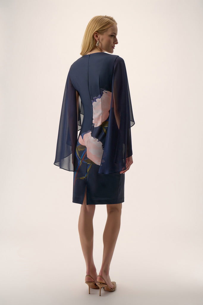 Elegant and effortlessly chic, this sheath dress features flowy chiffon cape sleeves and a captivating floral print, making it perfect for any special occasion. Crafted from luxurious silky knit, it offers a comfortable fit with a flattering drape that falls gracefully below the knee.