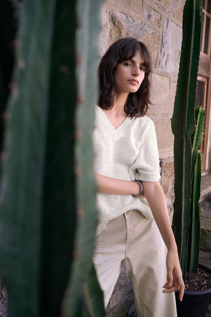This viscose and lurex top is designed with a relaxed straight silhouette. A V-neckline and extended short dolman sleeves with rib trim give it an easy finish that balances polish and comfort.