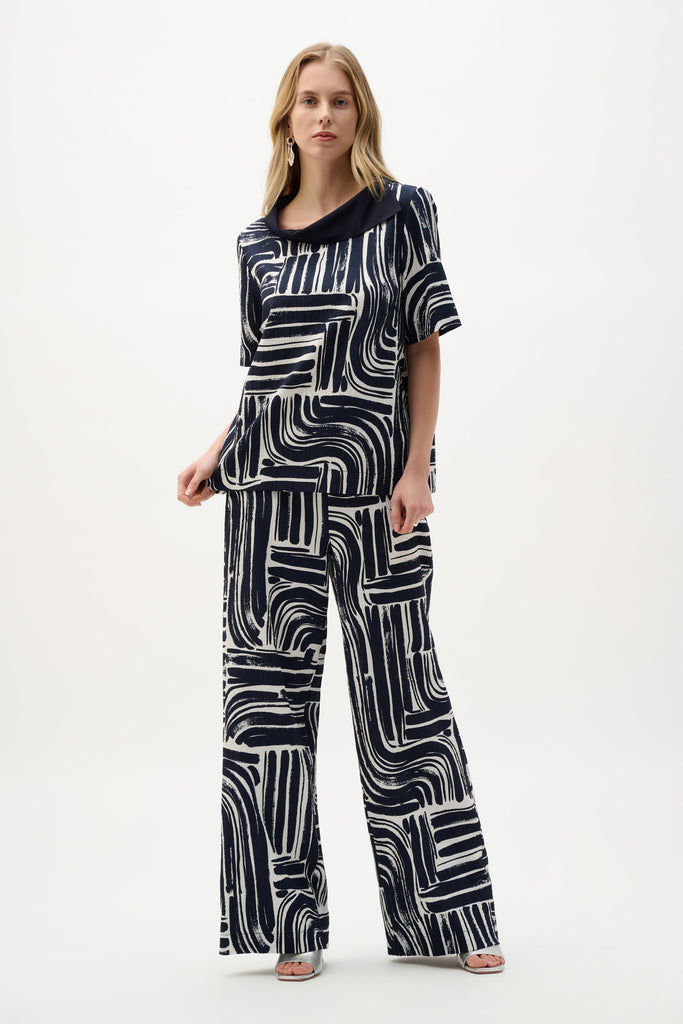 This abstract print seersucker straight top is elevated by a softly draped cowl collar in solid georgette for contrast. Short straight sleeves and subtle side slits give the silhouette ease and movement.